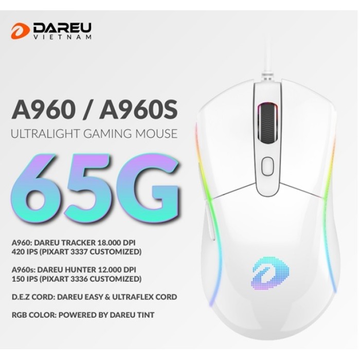 - Chuột chơi Gaming DAREU A960s ARTIC - ULTRALIGHT (HUNTER PWM3336, LED RGB) (USB/Trắng)
